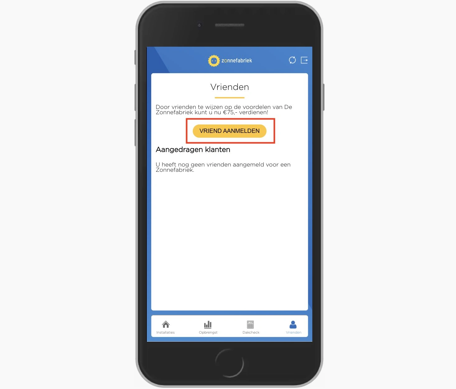 Open de Mijn Zonnefabriek app op uw smartphone. Klik onderin rechts op het icoontje voor ‘vrienden’. Klik vervolgens op ‘vriend aanmelden’. U kunt hier de naam, het e-mail adres en het telefoonnummer van de persoon die u wilt aandragen, invullen.