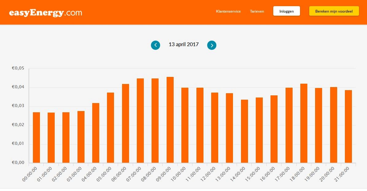 Als consument zou je hier je voordeel mee kunnen doen, mits je in staat bent om je verbruik over de dag aan te passen, en mits je van tevoren weet wat het uurtarief gaat zijn voor de komende tijd. Op de website van Easy Energy is de stroomprijs voor de komende dagen te zien. De prijs is meestal ’s nachts lager en overdag hoger, met een piekje in de ochtend en in de vroege avond.